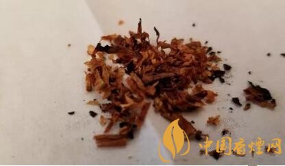 煙絲從外觀上檢視,由棕黃和明黃煙絲組成,品級不錯。煙絲切寬1mm左右。間雜切成細小圓片裝的煙梗。用料還是比較考究的。