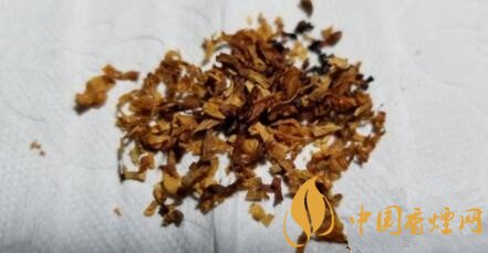 煙絲以明黃為主,輔以少量的棕黃色煙絲,顯然是不同兩種不同品級的原片切絲混合而來,間雜有切得較細、揉捻的比較柔軟的煙梗。配方調(diào)和與現(xiàn)款零售版基本一致。