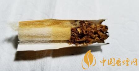 剖開濾嘴,降焦孔開在了一段式絲束的前1/3段。由于煙氣量充裕的關系,前段絲束顏色較深一些,后段淡黃,總體顏色變化均勻一致,空氣的導入效果明顯。