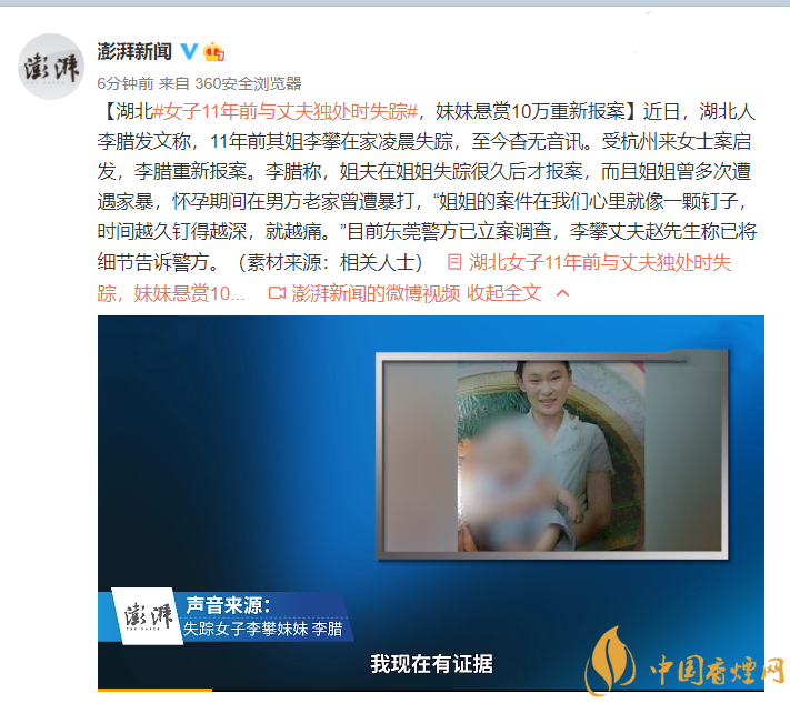 以上就是對湖北女子11年前與丈夫獨處時失蹤,妹妹重新報案的事件報道,具體事件發(fā)展還要等警方調(diào)查結(jié)果,后續(xù)發(fā)展我們將繼續(xù)跟進(jìn)。想了解更多時事熱點,請關(guān)注香煙網(wǎng)!