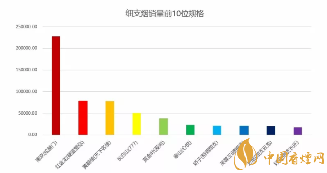 2、如圖所示2018細(xì)支煙排行榜(規(guī)格銷量)圖:在2018第一季度中國細(xì)煙排行中1-3月細(xì)支煙銷量前10規(guī)格:第一名南京(炫赫門)/第二名紅金龍(硬藍(lán)愛你)/第三名黃鶴樓(天下名樓)/第四名:長白山(777)/第五名:黃金葉(愛尚)/第六名:泰山(心悅)/第七名:嬌子(格調(diào)細(xì))/第八名:芙蓉王(硬細(xì)支)/第九名:云煙(細(xì)支云龍)/第十名:好貓(細(xì)支長樂)