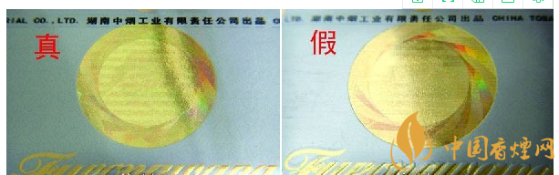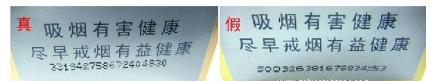 ①平放在桌上,斜角45度觀察靜止?fàn)顟B(tài)下的激光全息圖案:真品卷煙圖案表面燙金平整、干凈,能照射出影像來(lái),且無(wú)任何污垢痕跡;假冒卷煙表面印刷粗糙,能明顯看出表面定位燙金有脫皮現(xiàn)象,污垢痕跡明顯,表面如同銅鏡上附著一層霧氣看上去較模糊不清。