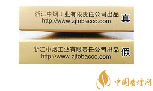 真煙鋼印為機器動態(tài)打印,整體鋼印較深、間距不等,其位置與企業(yè)網(wǎng)址重疊;假煙鋼印一般為手工靜態(tài)打印,鋼印較淺,位置與文字重疊。