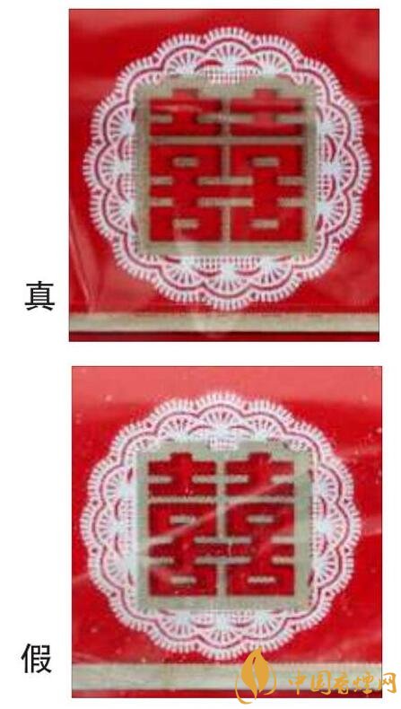 真煙“囍”字體紅色色彩均勻,白色花型圖案的線條較清晰;假煙“囍”字體紅色色彩深淺不一,字體邊緣鋸齒狀明顯,白色花型圖案整體較模糊。
