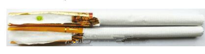 真煙煙支采用爆珠濾嘴,中間有一顆綠色的小爆珠,接裝紙顏色為金黃色,長(zhǎng)度為40mm;假煙煙支采用單一醋酸濾嘴,接裝紙顏色為黃色,長(zhǎng)度為34mm,與真品特征存在明顯差異。