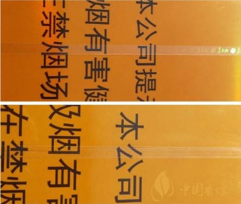 該款假冒卷煙透明紙燙封處“魚(yú)鱗狀”不規(guī)則氣泡較多而且水汽痕跡明顯;燙封線條呈現(xiàn)弧線。(圖4上真下假)
