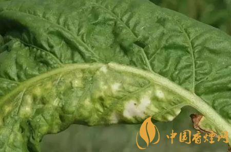 癥狀:幼嫩葉片發(fā)?。翰∪~直立;較大葉片發(fā)?。撼跗谛纬牲S色圓斑,后病斑中間下陷,背面產(chǎn)生灰色或藍色霉層,嚴重時病斑融合成褐色壞死大斑,病葉皺縮扭曲。常表現(xiàn)系統(tǒng)感染,煙株矮化凋萎。在花、蒴果上也出現(xiàn)病斑。