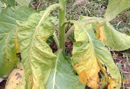 癥狀:煙草青枯病是維管束病害,典型癥狀為枯萎,病株多為一側枯萎,拔出后可見發(fā)病的一側支根變黑腐爛,未顯癥的一例根系大部分正常。葉片發(fā)?。撼跗谲浕瑁詾榍嗌?,故稱“青枯病”,隨著細菌充滿葉脈,兩天后葉脈變黑,葉內(nèi)為黃色網(wǎng)狀病斑。莖發(fā)病:出現(xiàn)長形黑色條斑,有的條斑擴展到病株頂部或枯萎的葉柄上。到發(fā)病中后期,全部葉片萎蔫,條斑表皮變黑腐爛,病株莖和葉脈導管變黑,根部也變黑腐爛,甚至莖髓部呈蜂窩狀或全部腐爛形成空腔,僅留木質部。橫剖病莖用力擠壓切口,從導管溢出黃白色菌膿。