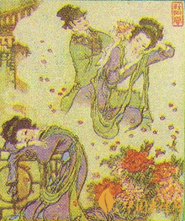 第三枚為“驚夢”,展現(xiàn)了杜麗娘的夢境:在牡丹盛開的涼亭下,柳生正將一朵艷麗的牡丹插戴在她的鬢間;第四枚為“寫真”,展現(xiàn)的是杜麗娘作自畫像的情景;第五枚為“婚走”,描繪的是柳生扶起起死回生的杜麗娘一起回家的一幕,極具浪漫主義色彩。