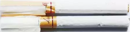真品商標(biāo)紙采用銅版紙,凹印印刷,正面“長過濾嘴香煙”字體邊緣有明顯的鋸齒狀,“利群”字體筆畫較粗;假煙商標(biāo)紙采用高清掃描仿制膠印印刷,正面“長過濾嘴香煙”字體邊緣較光滑無鋸齒狀,“利群”字體筆畫明顯偏細(xì),商標(biāo)紙印刷工藝與真品特征存在明顯差異。(左真右假)