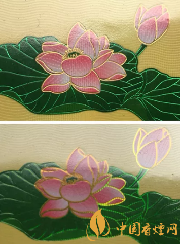 真品卷煙商標紙上的荷花花瓣采用漸變技術(shù),顏色由粉紅色向白色過渡,花蕊處金色線條清晰,圖案印刷自然協(xié)調(diào),立體感強;假煙采用普通仿制技術(shù),顏色搭配較為死板,花蕊處金色線條模糊、擠成一團,圖案印刷粗糙、立體感差。