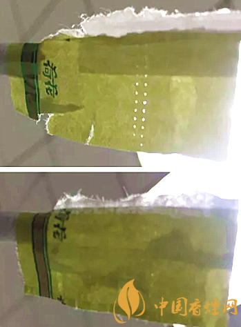 真品卷煙拉帶頭呈規(guī)則的半橢圓狀,邊緣光滑、平整;假煙拉帶頭形狀不規(guī)則,邊緣粗糙、有毛刺。