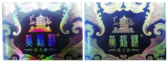 真品小盒正反面均采用具有黃色、紅色、紫色、藍(lán)色和綠色等干涉色的效果珠光油墨,在不同光線角度下會(huì)呈現(xiàn)出不同顏色,同時(shí)也具有能阻止掃描儀、電分機(jī)及彩色復(fù)印機(jī)的復(fù)制功能;假煙在不同光線角度無(wú)法呈現(xiàn)出彩色光線變化,因多采用高清掃描復(fù)制,其圖片多邊緣呈現(xiàn)顆粒粗大的網(wǎng)格狀,與真品材質(zhì)存在顯著差異。