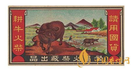 上世紀30年代,啟昌火柴廠出品的“耕牛”(圖1)火花,就描繪了一幅美麗的山村春耕圖:在數(shù)棵綠油油的樹木點綴下,幾戶農家散落分布于山腳前的農田里,一位頭戴斗笠的農夫正扶犁驅牛耕田,近處則是一頭碩大的水牛目視前方的形象。