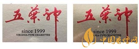 真品卷煙:“五葉神”字體筆畫流暢自然,套印準(zhǔn)確,筆畫基本無凸起,字體筆畫顏色為鮮紅。