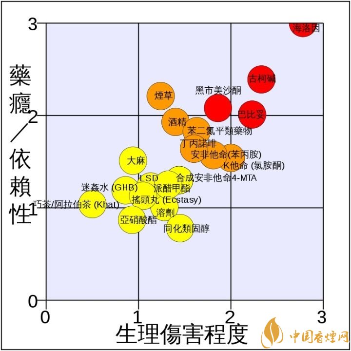 結(jié)尾分享一下剛看到的研究發(fā)現(xiàn)。20位從事依賴(lài)性治療的精神病醫(yī)師,在二十種常見(jiàn)管制藥品比較其傷害性(橫軸)及成癮性(縱軸),于2007年發(fā)表在權(quán)威醫(yī)學(xué)期刊《柳葉刀》,顯示煙草在成癮性排名第三,潛在危害程度排名第七,可見(jiàn)煙草的依賴(lài)性和傷害可能比某些傳統(tǒng)毒品還大。