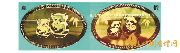 鐳射防偽標(biāo)識(shí)差異對(duì)比:真煙鐳射防偽標(biāo)識(shí)清晰、無漏色,竹葉葉片清晰光滑無條紋,兩只小熊貓身上和頭頂?shù)拿旨?xì)均勻;假煙鐳射標(biāo)識(shí)粗糙模糊,竹葉葉片有條紋狀,兩只小熊貓有漏色,身上和頭頂?shù)拿植诓痪鶆颉?/p>